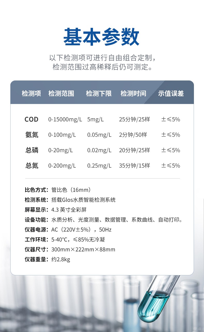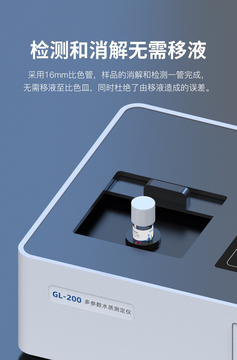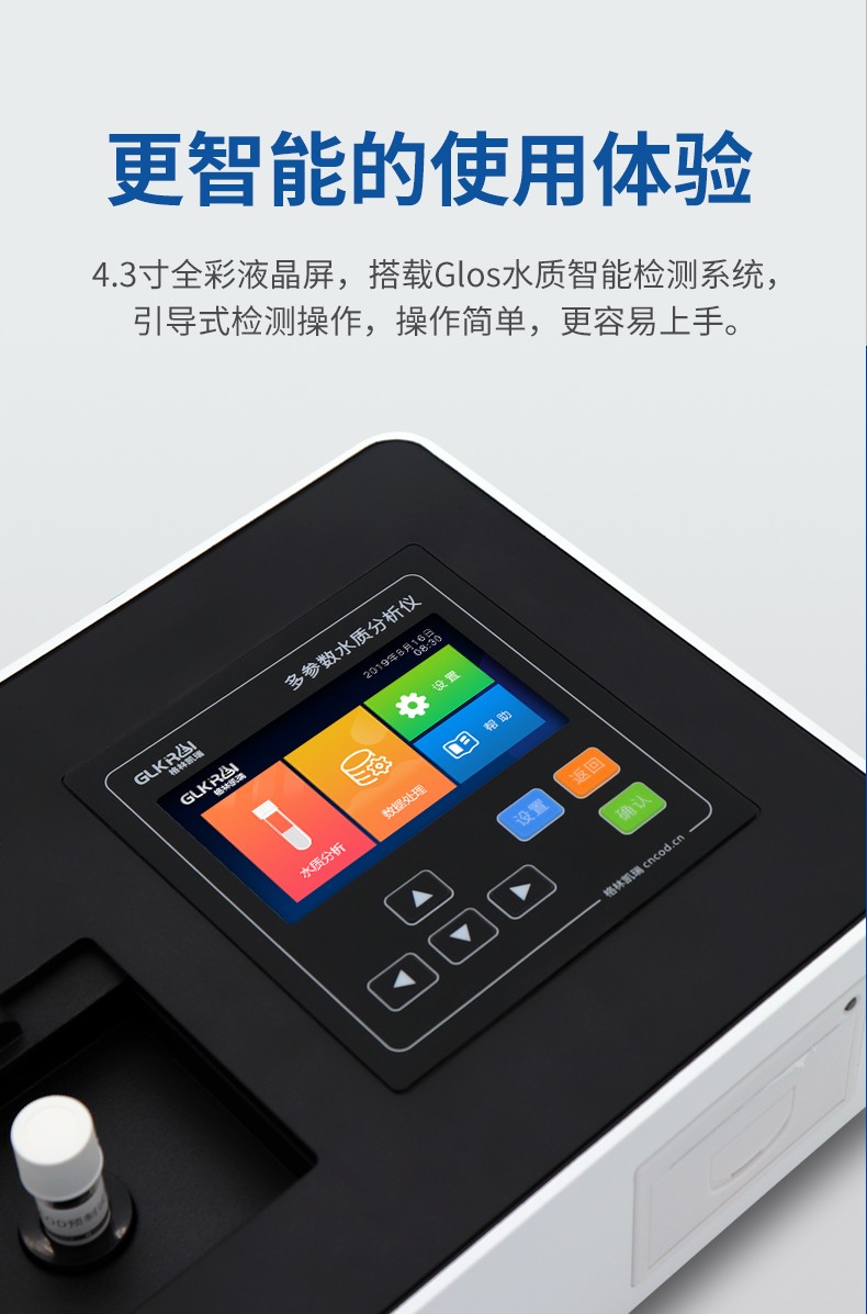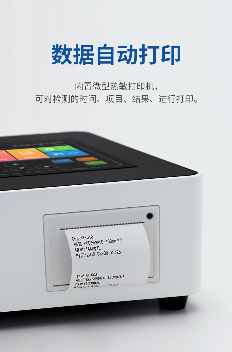 测定项目的原理符合环保行业认可方法。比色方式采用管比色,无需移液至比色皿便能快速测定水质中 COD、氨氮、总磷、总氮的浓度,内置微型热敏打印机,检测完毕即可打印数据,测试数据可通过U盘导出。设备搭载“Glos⽔质智能检测系统”让检测变得简单智能。