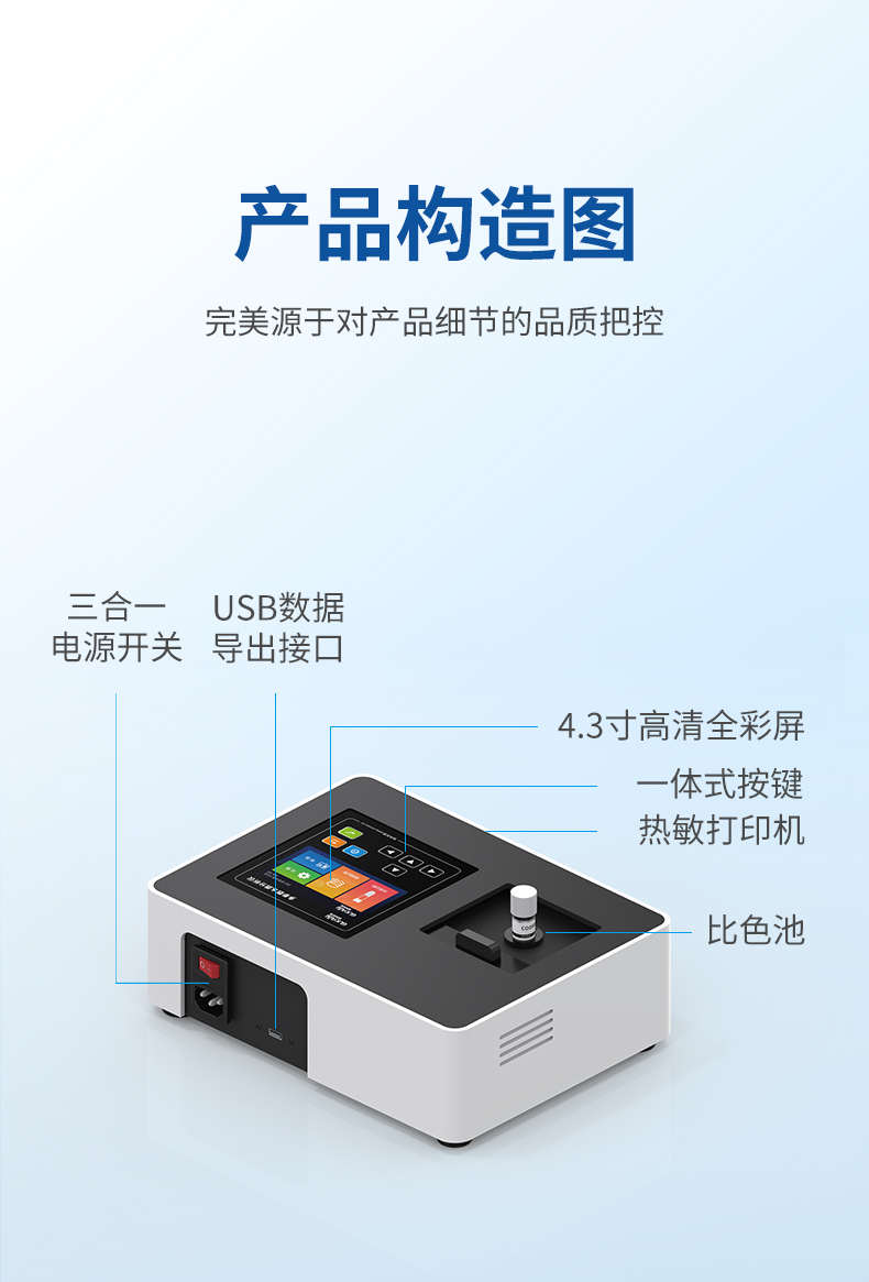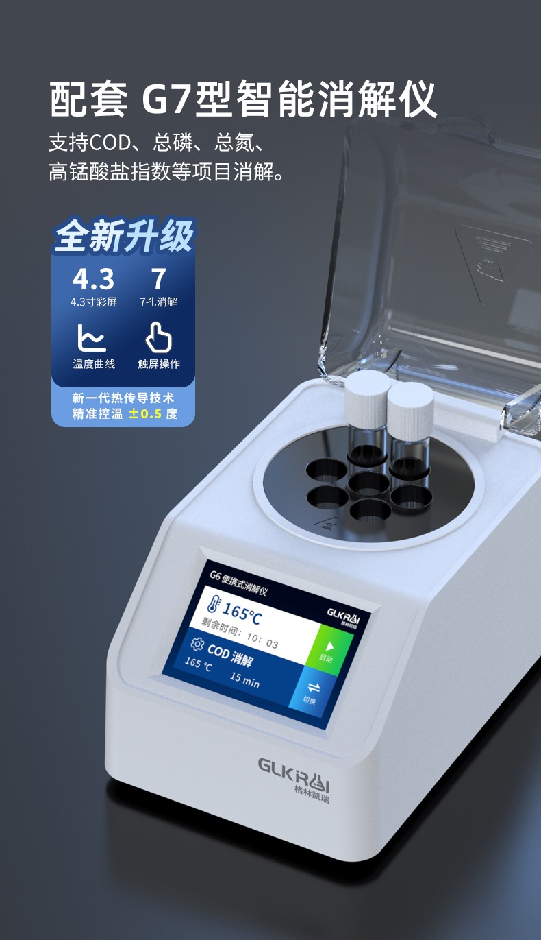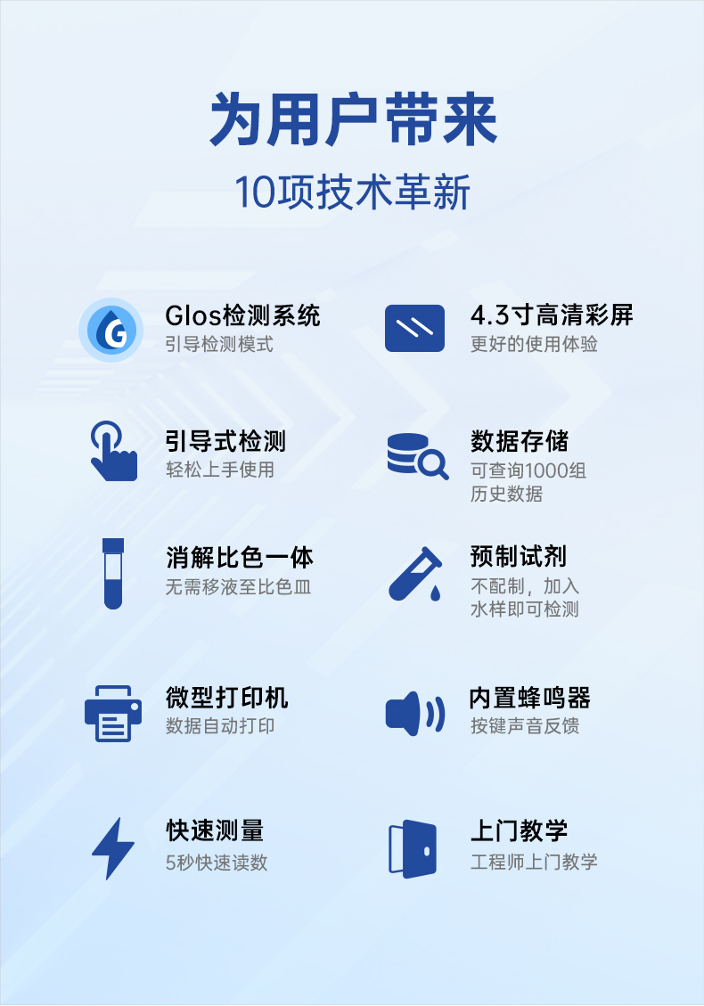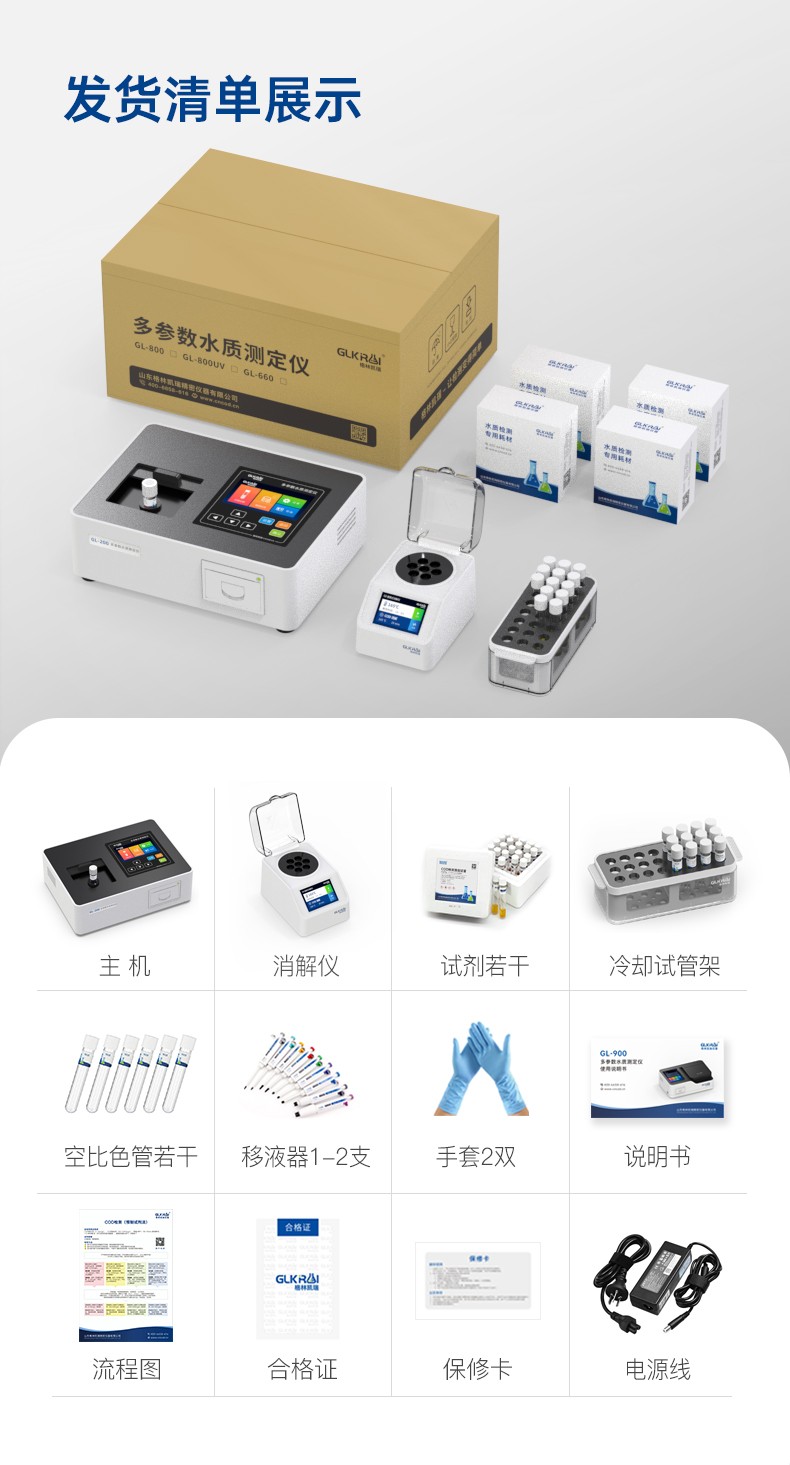 测定项目的原理符合环保行业认可方法。比色方式采用管比色,无需移液至比色皿便能快速测定水质中 COD、氨氮、总磷、总氮的浓度,内置微型热敏打印机,检测完毕即可打印数据,测试数据可通过U盘导出。设备搭载“Glos⽔质智能检测系统”让检测变得简单智能。
