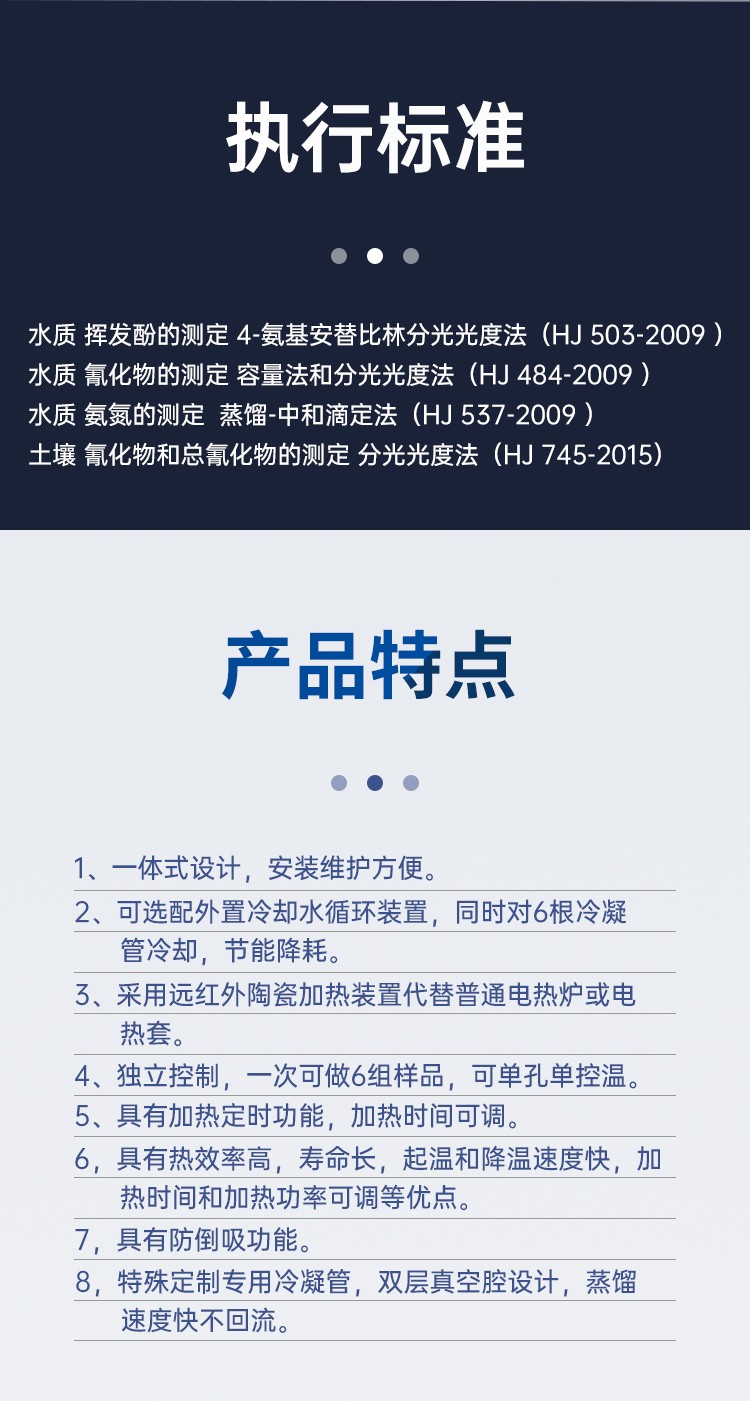 多功能蒸馏仪同时采用智能控温、智能数字定时、自来水循环冷却等技术手段,实现了美观实用、节能环保等目的,可广泛适用于检测领域,如挥发酚、氰化物、氨氮、凯氏氮、油中水份等项目的蒸馏处理。