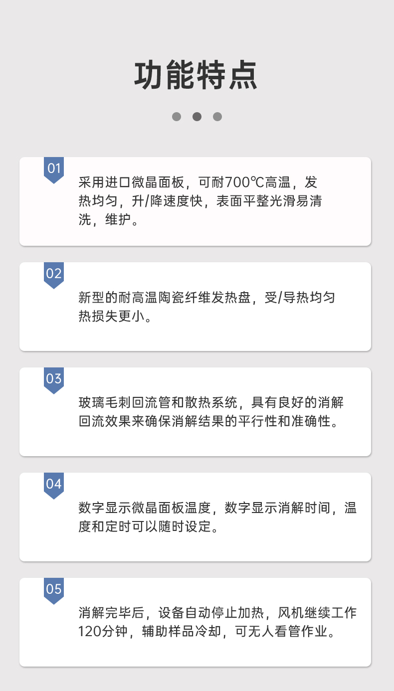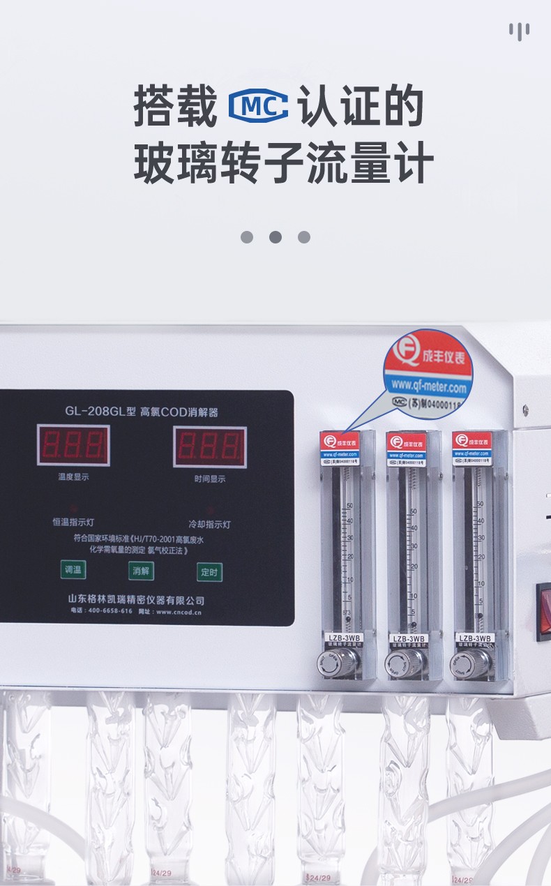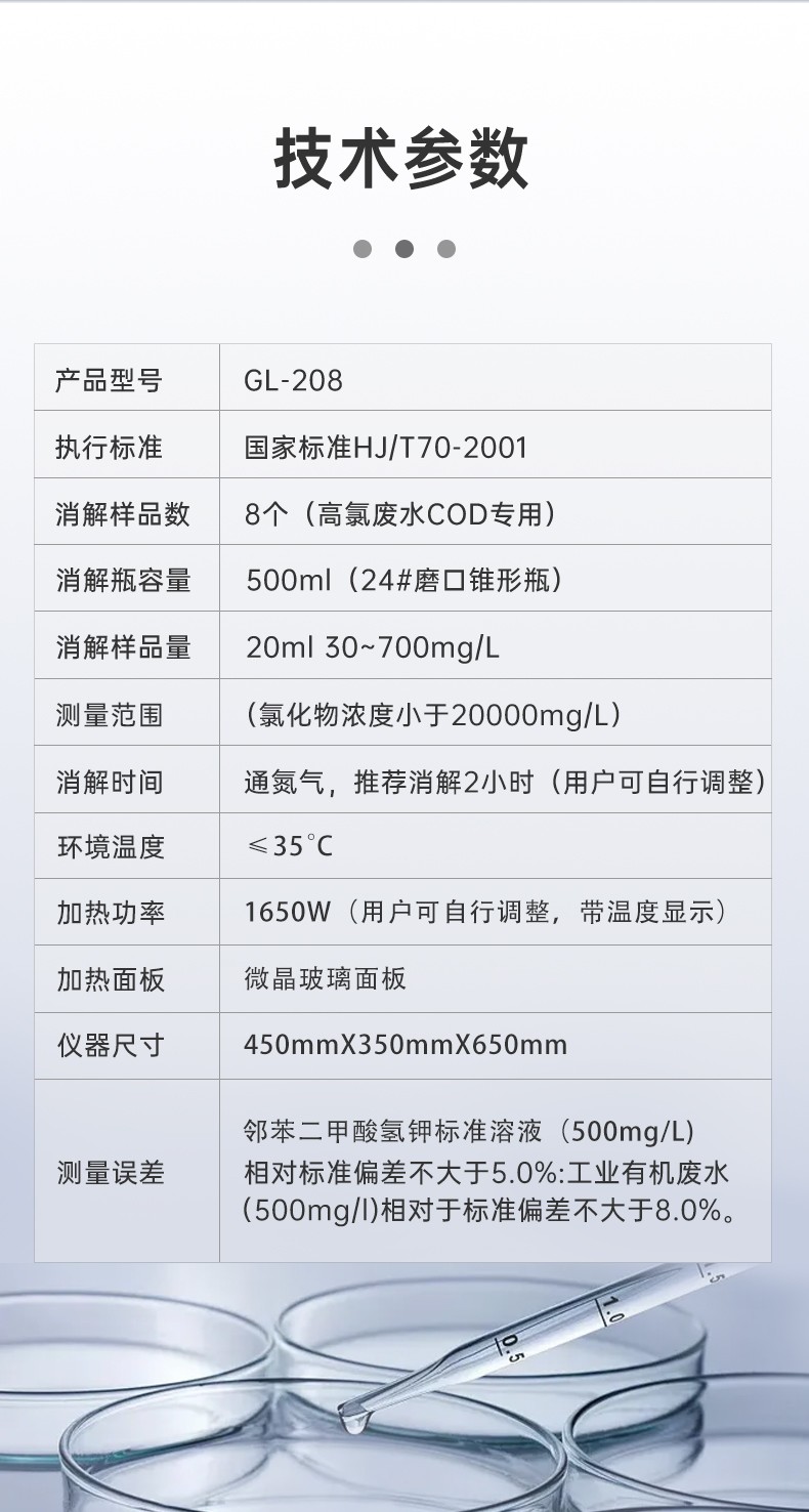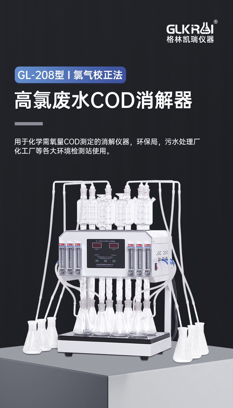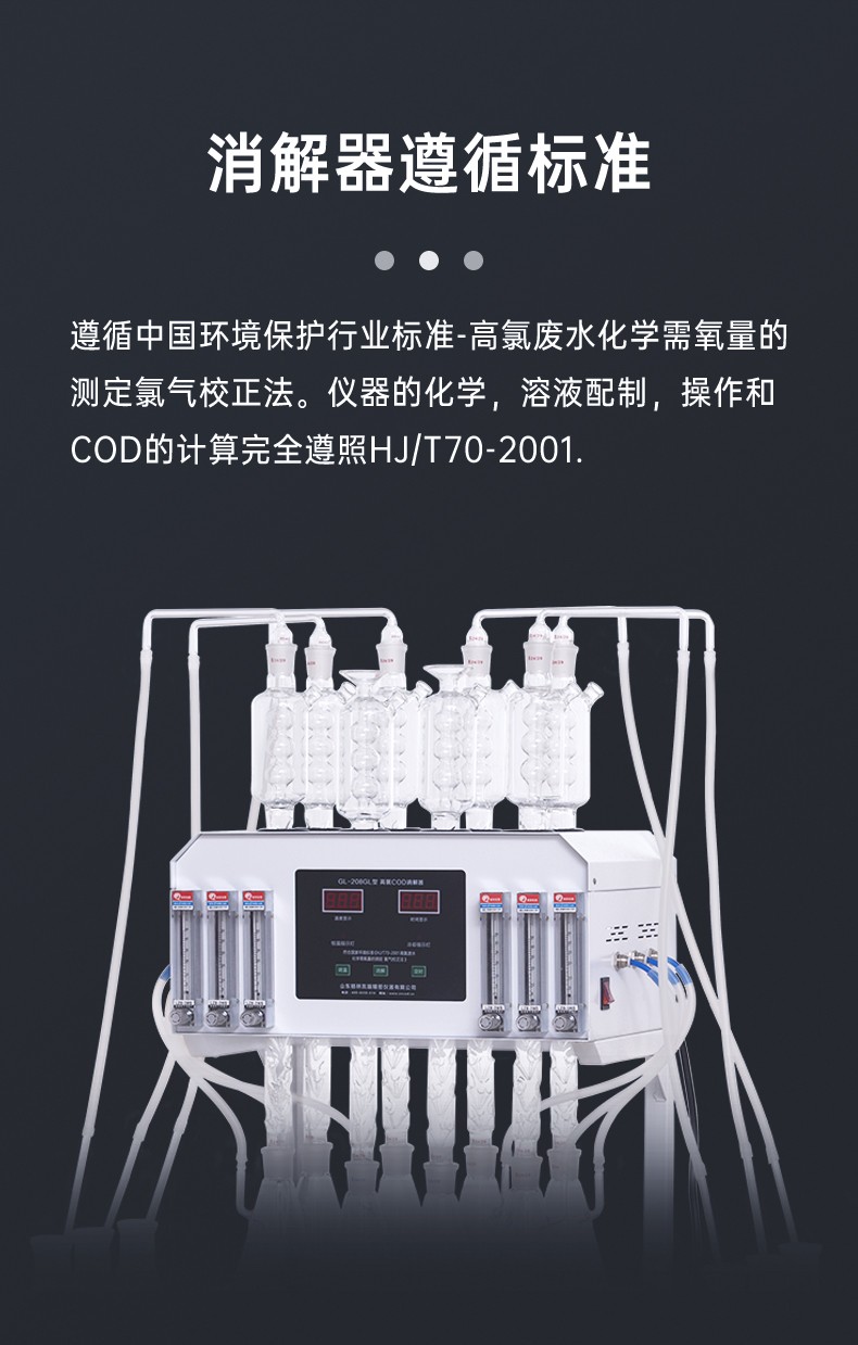 高氯COD消解器遵循国家标准:高氯废水化学需氧量的测定氯气校正法,仪器的化学溶液配制、操作和COD的计算遵照 HJ/T70-2001,适用于氯离子含量小于20000mg/L的高氯废水中COD的测定。