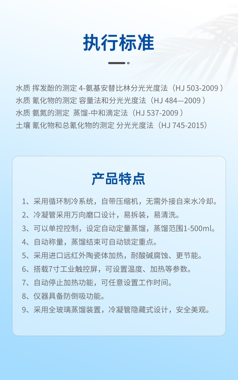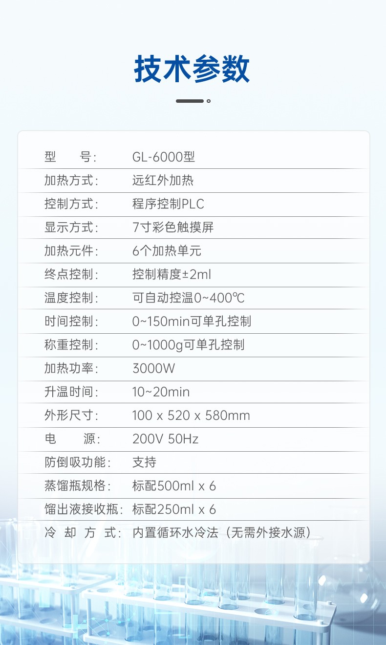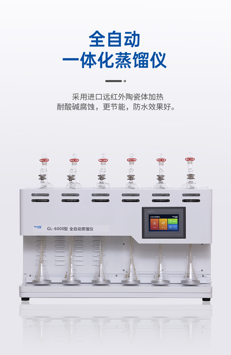 全⾃动蒸馏仪采用智能⼀体化设计,集远红外加热、制冷功能、智能控温、智能数字定时、馏出液终点重量控制、 内置循环冷却水、防倒吸保护等技术,防爆沸、馏出液量任设等功能。
