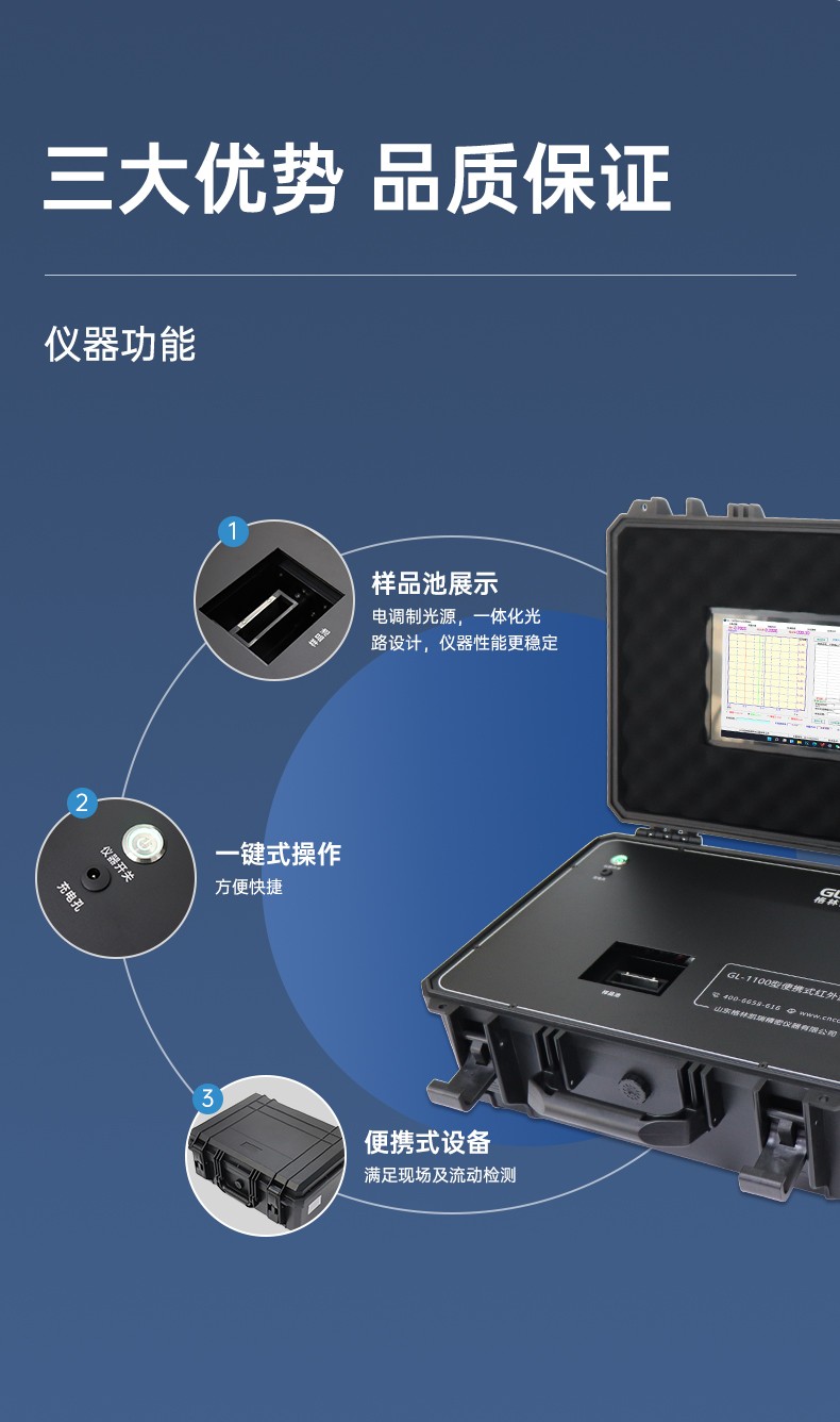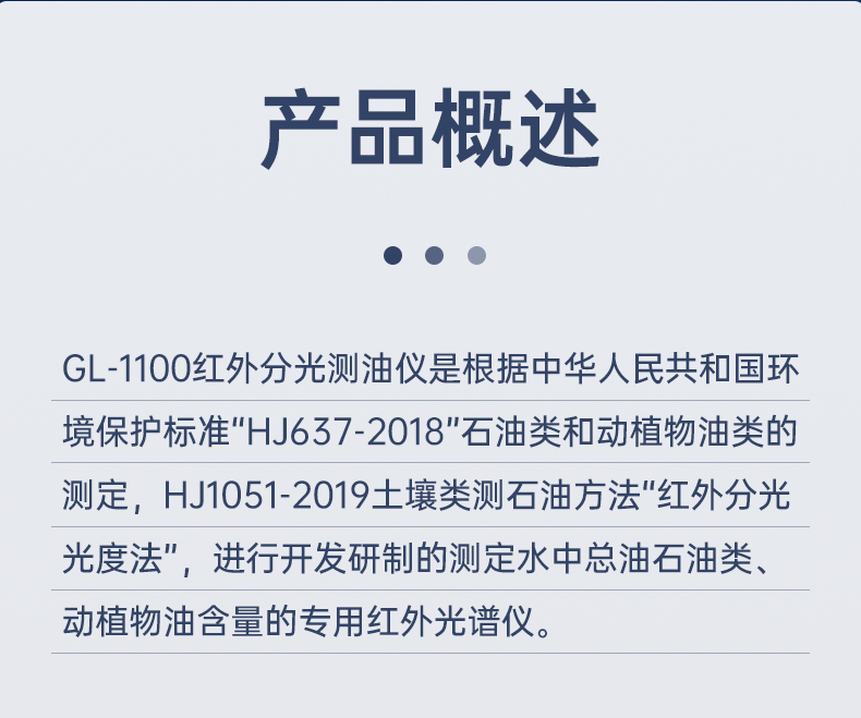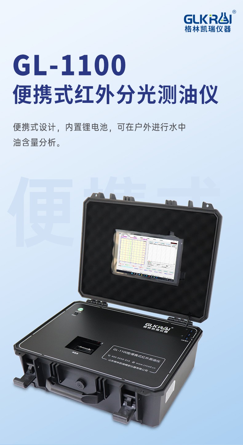 GL-1100便携式红外分光测油仪是根据中国环境保护标准“HJ637-2018”石油类和动植物油类的测定、“HJ1051-2019”土壤类测石油方法 红外分光光度法,进行开发研制的测定水中总油、石油类、动植物油、土壤类石油含量的专用红外光谱仪。