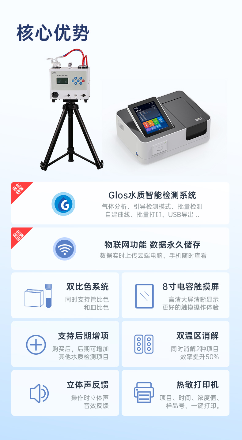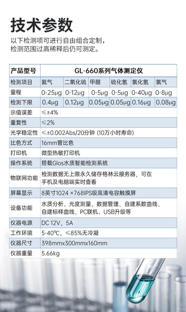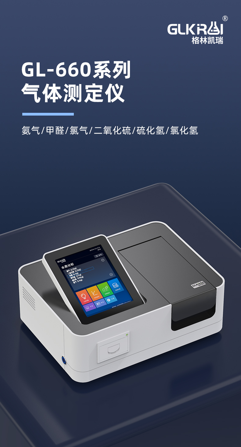 GL-660 系列氯气测定仪,氯气的测定原理符合环保标准《HJ533-2009固定污染源排气中氯气的测定 甲基橙分光光度法》和卫生部标 准《GBZ/T 160.37-2004 氯气的甲基橙分光光度法》。