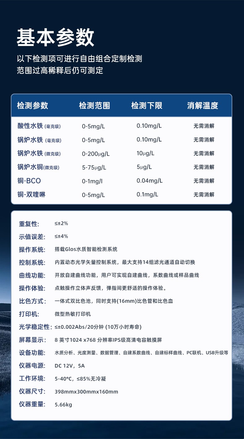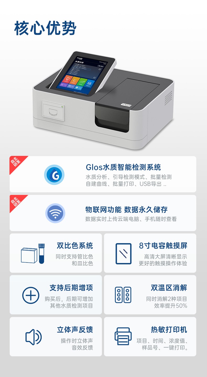 测定项目的原理符合环保行业认可方法,设备的光源、传感器为国外进口,拥有更稳定的光学性能,设备搭载自主研发的Glos水质智能检测系统和一体式双比色池技术,使检测变得更简单,更稳定。