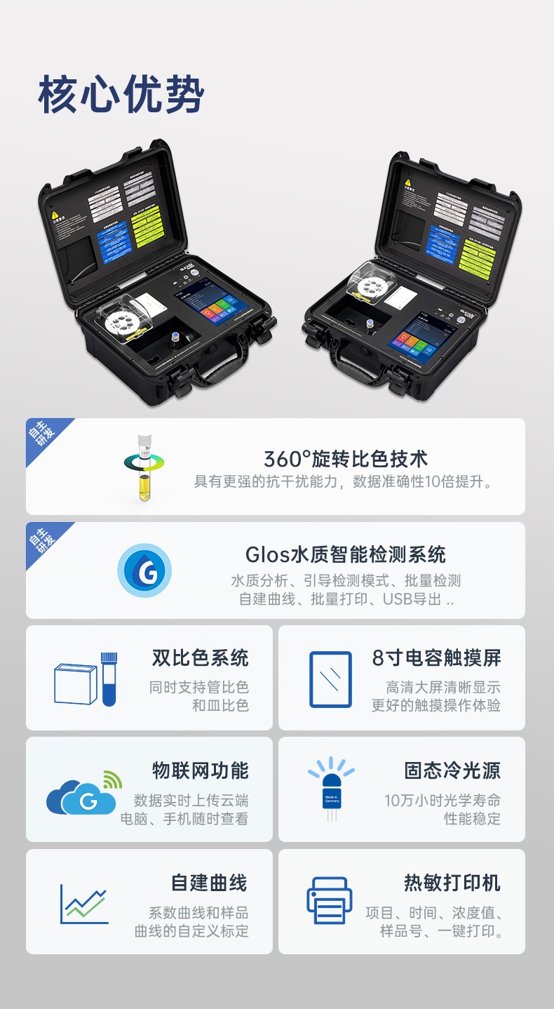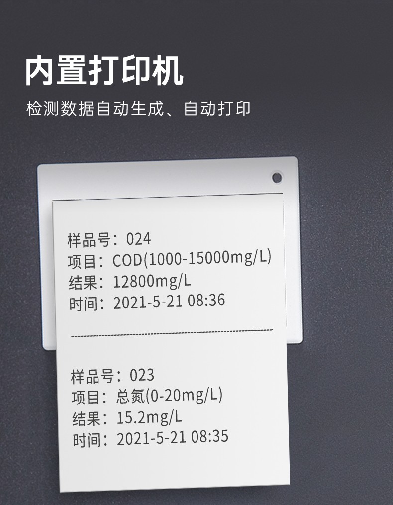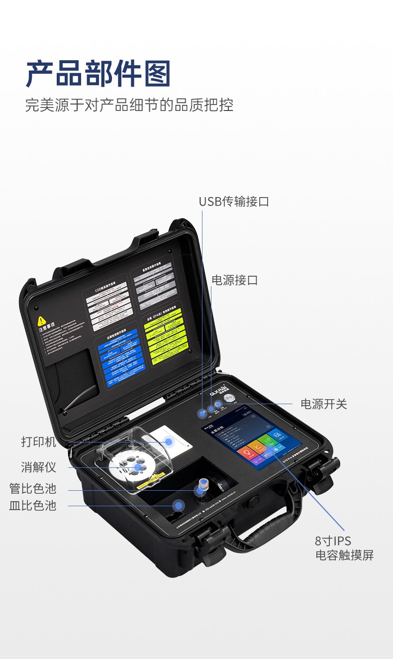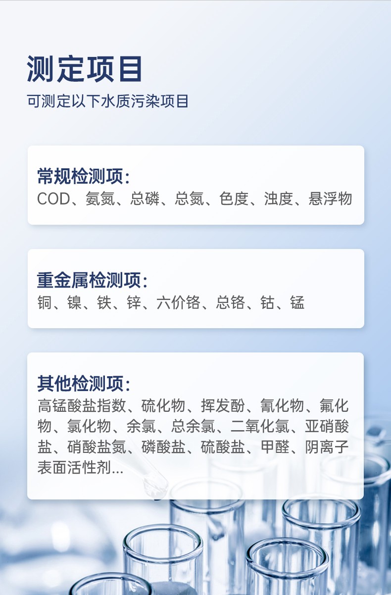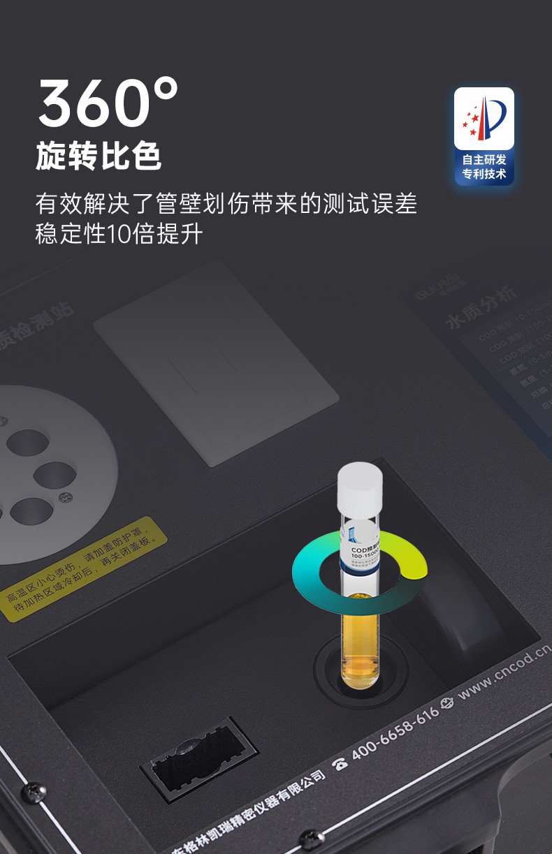 内置锂电池可实现无外接供电工作,测定项目的原理符合环保行业认可方法,搭载进口光源及传感器和先进的光学结构设计,同时支持管比色和皿比色,其管比色采用的360°旋转比色方式,能为测定数据提升10倍的稳定性,有效解决了管壁划伤带来的测试误差。