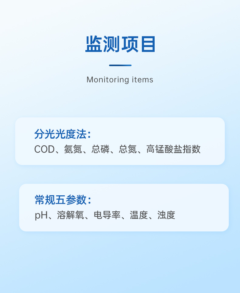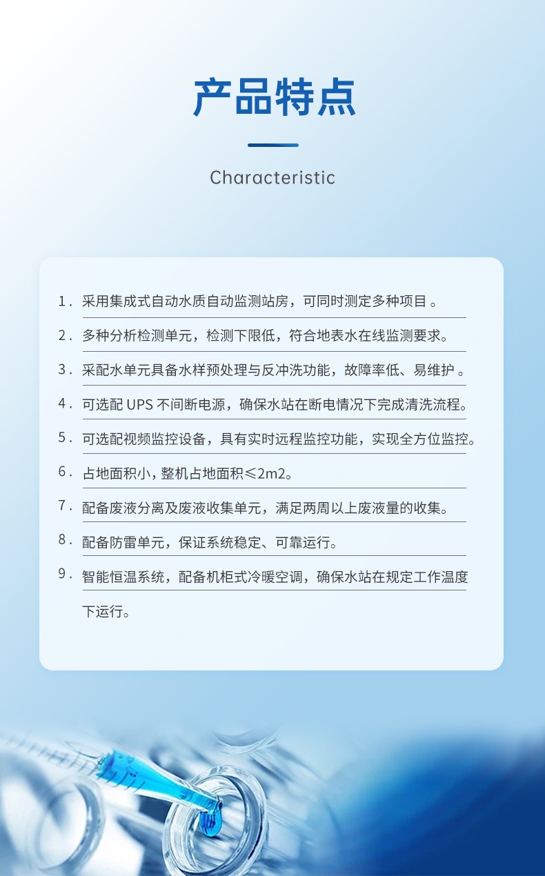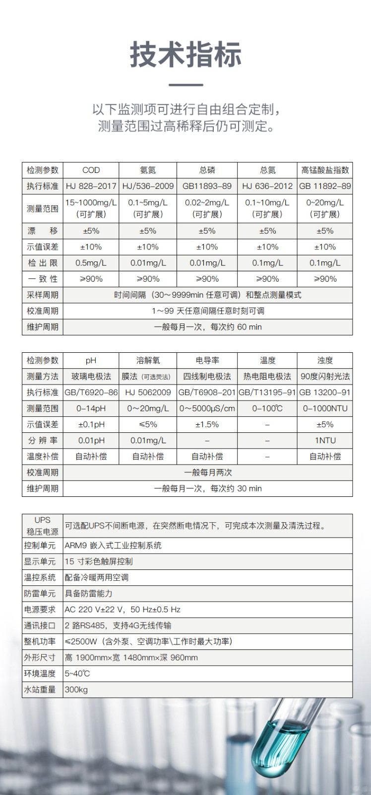 符合地表水在线自动监测要求,包含采配水系统、检测单元(COD、氨氮、总磷、总氮、⾼锰酸盐指数、常规五参数)、质量控制单元、辅助单元 (废液收集、防雷、空调等)。